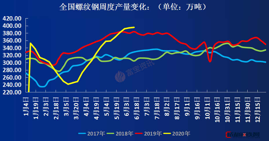 圖3:2017—2020年全國螺紋鋼周度產(chǎn)量變化走勢圖(單位:萬噸)