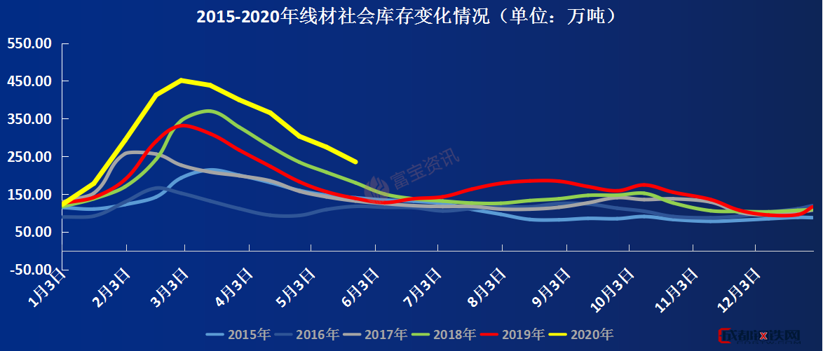 圖2:線材2015年—2020年每周庫存總量走勢圖(單位:萬噸)