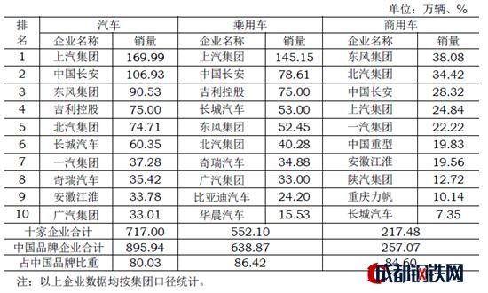 2017年1-8月中國品牌汽車分車型前十家生產企業(yè)銷量排名