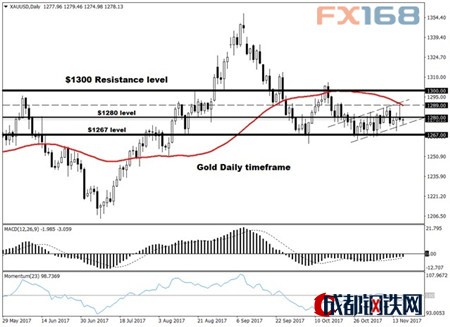 周三(11月15日)交易時(shí)段,金價(jià)攀升至1289美元/盎司三周高位,隨后大幅下跌,此前美國(guó)樂觀的數(shù)據(jù)增強(qiáng)了人們對(duì)美國(guó)12月加息的預(yù)期。盡管投資者的謹(jǐn)慎情緒以及對(duì)美國(guó)稅收改革推遲的擔(dān)憂持續(xù)仍在激勵(lì)看漲黃金的人士,但美國(guó)加息預(yù)期升溫使得空頭受到提振。價(jià)格走勢(shì)表明,黃金被困在狹窄區(qū)間之內(nèi),并需要一個(gè)催化劑來推動(dòng)下一個(gè)重大走勢(shì)。
