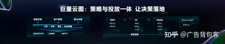 在數(shù)據(jù)層面,巨量引擎將串聯(lián)人群、內(nèi)容、商品等不同的營(yíng)銷(xiāo)要素,實(shí)現(xiàn)洞察、資產(chǎn)管理與整合決策,完整閉環(huán),幫助客戶看清生意,做好決策。今年,平臺(tái)一方面從人群角度沿著5A繼續(xù)下探,將人群打通到商品粒度推出【商品5A】模型,另一方面推出【爆文】和【爆品】,幫助品牌提前發(fā)現(xiàn)好的種草內(nèi)容、定位潛力爆品。在決策落地層面,巨量云圖將平臺(tái)上的品牌資產(chǎn)全部聚合沉淀,提供經(jīng)營(yíng)診斷—-資產(chǎn)管理—-整合決策三大核心能力,同時(shí)打通巨量千川等營(yíng)銷(xiāo)平臺(tái),實(shí)現(xiàn)策略洞察到投放優(yōu)化的完整閉環(huán)。經(jīng)營(yíng)側(cè)推出GTATM產(chǎn)品,幫助商家以GMV為目標(biāo),拆解到5A人群積累目標(biāo),并較終落地到投放觸點(diǎn)的預(yù)算分配,打通上游觸點(diǎn)投放和下游經(jīng)營(yíng)優(yōu)化。
