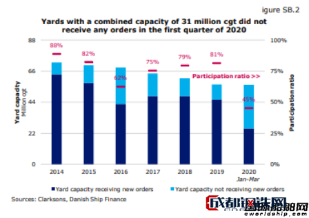 這是過去幾年來該比例首次低于50%。2014年一季度成功接單的船廠產(chǎn)能占比高達(dá)88%,2015年這一比例降至82%、2016年繼續(xù)降至62%,2017年回升至75%,到2019年持續(xù)回升至81%。