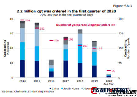 丹麥船舶金融公司的報告顯示,今年第一季度,僅有35家船廠獲得了新船訂單,相比2019年的149家同比減少了70%左右。