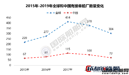 近年來,在新船訂單下降的同時,接單船廠數(shù)量也在減少。克拉克森的數(shù)據(jù)顯示,2017年-2019年,全球和中國有接單船廠的數(shù)量均呈下跌趨勢,且有接單船廠的數(shù)量在加速減少。2019年,中國有接單船廠數(shù)量降至僅72家。
