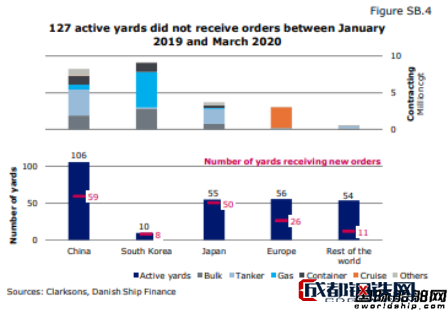 根據(jù)丹麥船舶金融公司的報告,從2019年年初至今,全球281家活躍船廠中有127家未能接獲任何一艘新船訂單,成功接單的船廠數(shù)量則為154家。這154家船廠中59家來自中國、8家來自韓國、50家來自日本、26家來自歐洲、還有11家來自其他地區(qū)。
