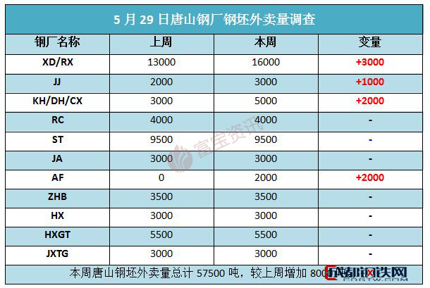 5月29唐山地區(qū)鋼廠鋼坯外賣量共計57500噸,較上周增加8000噸。