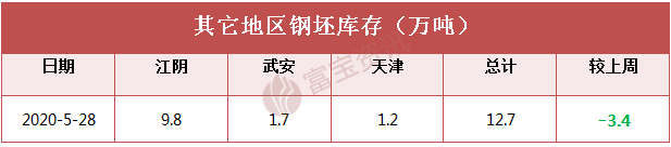 其他地區(qū)主要倉儲及港口鋼坯庫存總計12.7,較上周減少3.4,其中