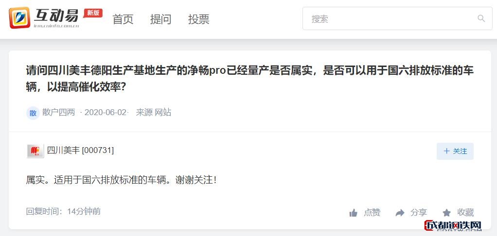 上證報(bào)中國(guó)證券網(wǎng)訊 有投資者提問四川美豐:德陽(yáng)生產(chǎn)基地生產(chǎn)的凈暢pro已經(jīng)量產(chǎn)是否屬實(shí),是否可以用于國(guó)六排放標(biāo)準(zhǔn)的車輛,以提高催化效率?對(duì)此,公司8日在互動(dòng)平臺(tái)上回應(yīng),量產(chǎn)屬實(shí)。適用于國(guó)六排放標(biāo)準(zhǔn)的車輛。