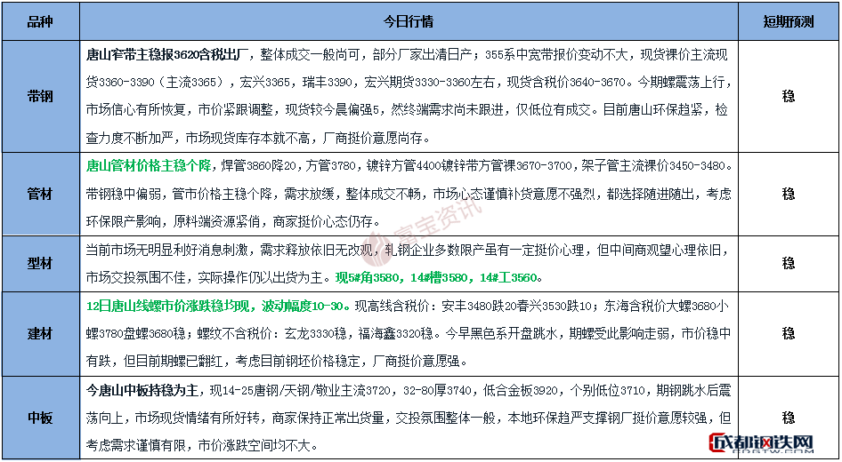 【唐山鋼市綜述】12日唐山窄帶主穩(wěn),整體成交一般尚可,部分出清日產(chǎn);線螺穩(wěn)中有跌,幅度10-30,成交情況一般;型價主穩(wěn)部分偏弱10,成交仍顯一般;廢鋼持穩(wěn)觀望,受雨季影響到貨欠佳;鋼坯直發(fā)成交偏弱,料午后價格堅挺。