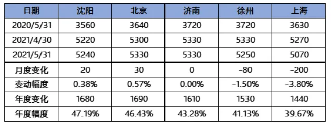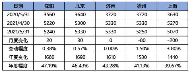 圖9:山東及周邊鋼市5月份價(jià)格漲跌情況數(shù)據(jù)來(lái)源:成都鋼鐵網(wǎng)3、下半年展望:具體來(lái)看經(jīng)歷了5月中下旬大跌之后,6月份整理回調(diào)后,山東價(jià)格跌至4900元/噸關(guān)口,鋼價(jià)逐步相對(duì)合理,部分上下游企業(yè)有托底或者抄底心態(tài)。其次,山東高爐出廠成本約4800元/噸水平,繼續(xù)回落成本支撐增強(qiáng)。此外,由于5月份鋼價(jià)大幅拉漲,部分下游企業(yè)階段性減緩采購(gòu),價(jià)格回落之后有補(bǔ)庫(kù)預(yù)期,需求有望在7月中旬后階段性好轉(zhuǎn)。從供應(yīng)來(lái)看,5月份山東鋼廠建筑鋼材總產(chǎn)量約230萬(wàn)噸水平,本計(jì)劃6月8日投產(chǎn)的永鋒臨港產(chǎn)線(xiàn)推遲到7月,供應(yīng)端壓力目前尚未顯現(xiàn)。從需求端來(lái)看,6-7月份山東鋼市正在經(jīng)歷旺季向年中相對(duì)淡季轉(zhuǎn)換,近幾年來(lái)每年都是5月份成交最好,但是今年6月整體價(jià)格起伏不大,說(shuō)明價(jià)格支撐尚存??傮w來(lái)看,在經(jīng)歷了5月份前所未有的過(guò)山車(chē)行情后,目前價(jià)格已經(jīng)回歸到鋼市相對(duì)能夠接受的水平,但是鋼廠對(duì)此仍不滿(mǎn)意,個(gè)人認(rèn)為低迷只是暫時(shí)的,臨港投產(chǎn)后或許又是一片新景象,下半年在粗鋼減產(chǎn)能夠落地的同時(shí)價(jià)格預(yù)計(jì)整體偏強(qiáng),山東價(jià)格或維持在4800-5400的區(qū)間運(yùn)行。