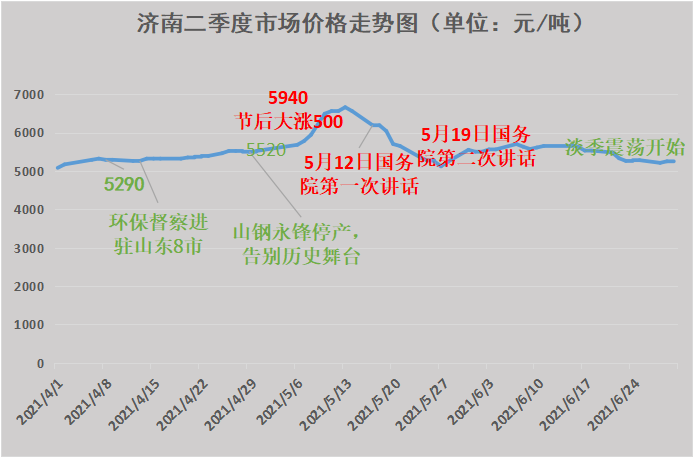 圖1/圖2:山東省一、二季度價(jià)格走勢(shì)圖及大事件回顧數(shù)據(jù)來(lái)源:成都鋼鐵網(wǎng)圖片已經(jīng)很清晰的為大家回顧了1-6月份的鋼市走勢(shì)情況以及引起轉(zhuǎn)折的重大事件,5月份山東鋼市經(jīng)歷了罕見(jiàn)的直線(xiàn)拉漲和快速回落,螺紋一度漲到6300元/噸的歷史新高,不過(guò)隨著價(jià)格大幅上漲,下游面臨成本增加的壓力,需求難以跟進(jìn),引發(fā)了行業(yè)和國(guó)家相關(guān)部委的密切關(guān)注,相信兩次國(guó)常會(huì)談話(huà)大家都不會(huì)忘記,在中旬一系列政策發(fā)布之后,鋼市逐步理性,價(jià)格高位回落。經(jīng)歷了6月份鋼市整體修復(fù),目前山東鋼市價(jià)格已經(jīng)調(diào)整到4900元/噸附近,當(dāng)下