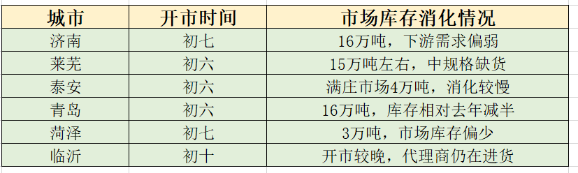 圖5:山東主流鋼材鋼市開(kāi)市時(shí)間及庫(kù)存情況數(shù)據(jù)來(lái)源:成都鋼鐵網(wǎng)4月底淄博