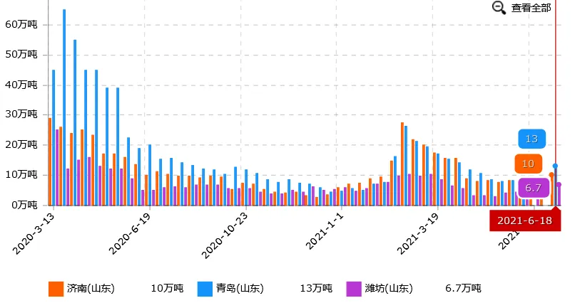圖7/8:山東城市庫(kù)存走勢(shì)對(duì)比圖數(shù)據(jù)來(lái)源:成都鋼鐵網(wǎng)從上圖的山東省內(nèi)社庫(kù)走勢(shì)圖不難看出今年的整體庫(kù)存情況相對(duì)2020年同期明顯好轉(zhuǎn),2020年3月初因?yàn)楣餐话l(fā)事件導(dǎo)致青島冬儲(chǔ)庫(kù)存難以消化,總庫(kù)存一度超過(guò)60萬(wàn)噸,上半年價(jià)格維持在3650元/噸左右震蕩,那是一段山東鋼貿(mào)人難忘的時(shí)光,今年的最高點(diǎn)仍然是春節(jié)后的兩周左右,不過(guò)庫(kù)存消化速度極其迅速,這也給鋼市強(qiáng)心劑為后來(lái)4-5月份的價(jià)格大漲帶來(lái)了底氣。 四、宏觀去產(chǎn)能政策導(dǎo)向性強(qiáng),下半年省內(nèi)價(jià)格或維持強(qiáng)勢(shì)1、首先,宏觀政策面:總結(jié)整個(gè)2021上半年的宏觀經(jīng)濟(jì)形勢(shì):從中國(guó)宏觀經(jīng)濟(jì)與金融鋼市來(lái)看,階段的結(jié)構(gòu)性改革是構(gòu)建“雙循環(huán)”新發(fā)展格局,要以?xún)?nèi)循環(huán)為主體、內(nèi)外循環(huán)相互促進(jìn),為此需要擴(kuò)大消費(fèi)并促進(jìn)消費(fèi)升級(jí),促進(jìn)產(chǎn)業(yè)結(jié)構(gòu)升級(jí),推動(dòng)要素自由流動(dòng),促進(jìn)新一輪區(qū)域一體化。鋼鐵行業(yè)重點(diǎn)關(guān)注的城市老舊小區(qū)改造、鄉(xiāng)村振興、以及產(chǎn)能升級(jí)等方面的信息逐步落實(shí)。這帶動(dòng)了整個(gè)鋼鐵行業(yè)進(jìn)入了后疫情的修復(fù)年度,雖然在房地產(chǎn)方面資金有所收緊,但是基建項(xiàng)目明顯進(jìn)度加快,這也給了鋼市帶來(lái)信心。2、季節(jié)性投機(jī)需求增多,鋼廠尋求南下突破口:自2017年河北東北材及蘇北材開(kāi)始批量流入山東鋼市以來(lái),除了冬儲(chǔ)月份,每月流入山東省內(nèi)的外省資源40-50萬(wàn)噸不等,個(gè)別月份甚至更多。但2020年第四季度,隨著山東鋼市需求減弱及本地鋼廠資源價(jià)格快速回落,造成了山東低于華東主流城市價(jià)格400-500的現(xiàn)象,當(dāng)月省外資源銷(xiāo)售無(wú)望,山東資源大量發(fā)往安徽、華東甚至華南地區(qū)。有目共睹隨著山東房地產(chǎn)剛需減弱,山東主流大廠也感受到了到供需結(jié)構(gòu)的轉(zhuǎn)換,去年底開(kāi)始主動(dòng)開(kāi)發(fā)南