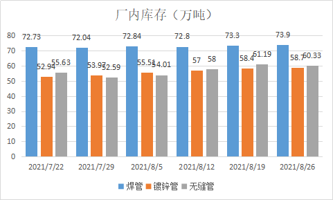 焊管產(chǎn)量為33.4萬(wàn)噸,廠內(nèi)庫(kù)存為73.9萬(wàn)噸,