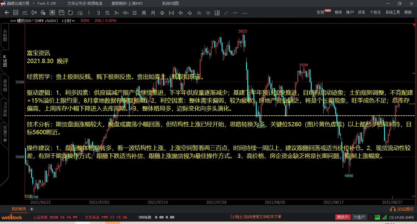 【期貨收評(píng)】滬螺2201收5354,漲206漲幅4%。今日期貨整體強(qiáng)勢(shì)上漲,上午突破前期新高站上5300,午后整體維持強(qiáng)勢(shì)盤面。今日最高5374,最低5184,日K收陽(yáng)線,料短期偏強(qiáng)運(yùn)行,短期目標(biāo)看到5500。滬深300弱勢(shì)震蕩運(yùn)行,收4813.27,跌0.29%,創(chuàng)業(yè)板想強(qiáng)后弱運(yùn)行,收3271.8,漲0.45%。