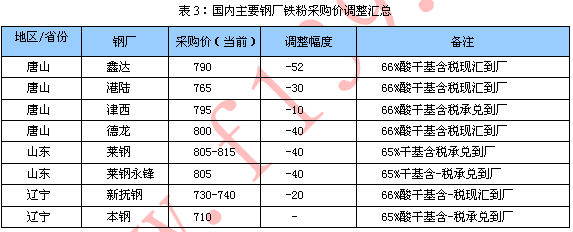 三、鋼廠及大礦動態(tài) 1.國內(nèi)主導鋼廠動態(tài) 本周國內(nèi)主導鋼廠內(nèi)粉采購依舊弱勢。本周普指持續(xù)低位,外礦多讓利成交,內(nèi)粉價格優(yōu)勢降低,加上成材價格較前期有所下滑,鋼廠壓價嚴厲。目前內(nèi)粉市場暫未出現(xiàn)止跌現(xiàn)象,預計下周鋼廠仍將繼續(xù)壓價。