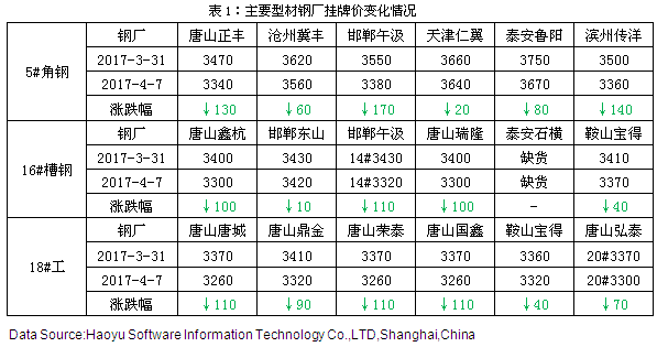 成都鋼鐵網(wǎng)資訊4月7日消息: 本周焦點(diǎn):對(duì)于短期行情,多數(shù)廠商都認(rèn)為,目前鋼坯還有一定的下跌空間,對(duì)型材成本支撐不足;另一方面,需求面的啟動(dòng)還是比較緩慢,市場(chǎng)成交難有亮眼表現(xiàn)。不過(guò)近期鋼廠檢修停產(chǎn)有所增多,廠家也不愿看到價(jià)格深跌,預(yù)計(jì)下周型材市場(chǎng)行情以小偏弱調(diào)整為主。 【內(nèi)容提要】 ◆本周型鋼市場(chǎng):跌勢(shì)不止,成交不佳 ◆唐山型材軋線開工率有所下降 ◆市場(chǎng)庫(kù)存小幅減少 ◆型廠理論盈利空間有擴(kuò)大 ◆預(yù)計(jì)下周型市偏弱為主 一、市場(chǎng)行情回顧