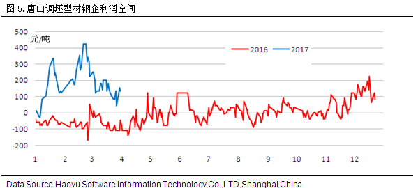 據(jù)2017年4月7日對(duì)上海市場(chǎng)型材倉(cāng)庫(kù)進(jìn)行的同口徑調(diào)查統(tǒng)計(jì)顯示,工角槽庫(kù)存4.76萬(wàn)噸,較上周減少0.11萬(wàn)噸,H型鋼庫(kù)存3.66萬(wàn)噸,較上周減少0.12萬(wàn)噸。 四、鋼廠盈利空間分析
