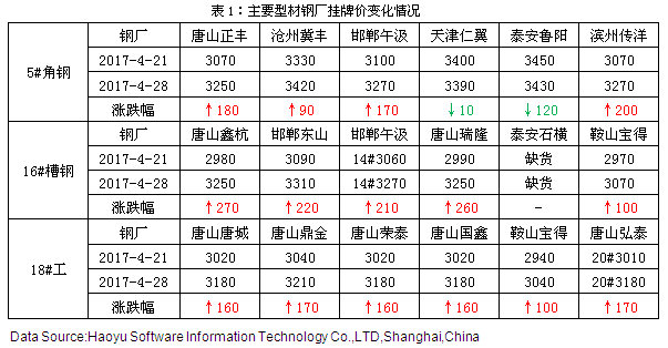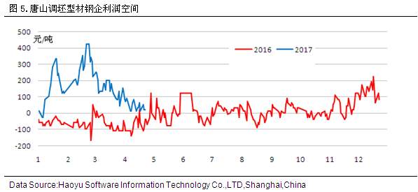 據(jù)2017年4月28日對(duì)上海市場(chǎng)型材倉(cāng)庫(kù)進(jìn)行的同口徑調(diào)查統(tǒng)計(jì)顯示,工角槽庫(kù)存4.56萬(wàn)噸,較上周減少0.31萬(wàn)噸,H型鋼庫(kù)存3.24萬(wàn)噸,較上周減少0.35萬(wàn)噸。 四、鋼廠盈利空間分析