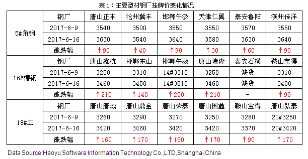 成都鋼鐵網(wǎng)資訊6月16日消息: 本周焦點(diǎn):對(duì)于后期的行情走勢(shì),目前從基本面上來看,還是以利空為主。六月份以來,北方高溫天氣增多,南方地區(qū)則以多雨為主,很大程度上影響了鋼材的下游需求,對(duì)行情走勢(shì)有消極影響。另一方面,目前鋼廠盈利空間較大,在淡季效應(yīng)的影響下,鋼廠的利潤(rùn)應(yīng)該且有空間收縮,這也會(huì)導(dǎo)致行情弱勢(shì)運(yùn)行。綜合預(yù)計(jì),下周型材市場(chǎng)可能偏弱運(yùn)行。 【內(nèi)容提要】 ◆本周型鋼市場(chǎng):低位反彈上行,行情有所好轉(zhuǎn) ◆唐山型材軋線開工率小幅上升 ◆市場(chǎng)庫存繼續(xù)增加 ◆型廠理論盈利空間仍處高位 ◆預(yù)計(jì)下周型市或偏弱調(diào)整 一、市場(chǎng)行情回顧