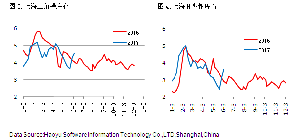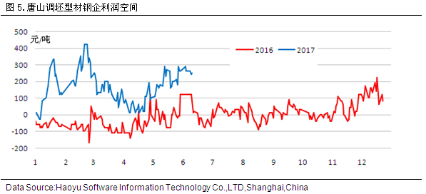 據(jù)2017年6月9日對(duì)上海市場(chǎng)型材倉庫進(jìn)行的同口徑調(diào)查統(tǒng)計(jì)顯示,工角槽庫存4.54萬噸,較上周增加0.24萬噸,H型鋼庫存3.62萬噸,較上周增加0.42萬噸。 四、鋼廠盈利空間分析
