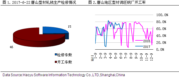 唐山型材鋼廠開工率上升。據(jù)成都鋼鐵網(wǎng)6月22日統(tǒng)計,44家型廠61條生產(chǎn)線開工46條,較上周增加14條,開工率為75.41%,較上周上升了12.66%。 三、市場庫存概覽