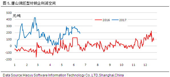 據(jù)2017年6月16日對上海市場型材倉庫進行的同口徑調查統(tǒng)計顯示,工角槽庫存4.76萬噸,較上周增加0.22萬噸,H型鋼庫存3.57萬噸,較上周減少0.05萬噸。 四、鋼廠盈利空間分析