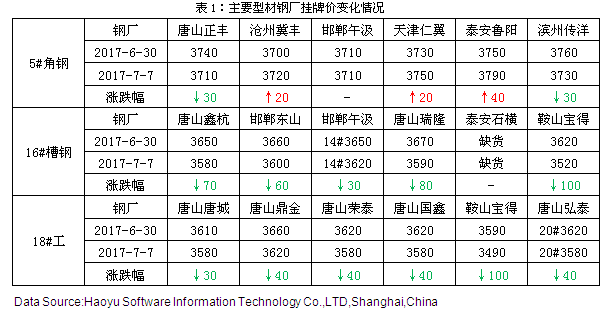 成都鋼鐵網(wǎng)資訊7月7日消息: 本周焦點(diǎn):已經(jīng)進(jìn)入了下半年,型市上半年穩(wěn)中上行,走勢良好。目前時(shí)處淡季,價(jià)格依然處于相對較高的位置,基本面還是相對較疲軟,這些都對行情比較利空。不過目前鋼廠檢修限產(chǎn)也比較多,有利于緩解供給壓力。再加上鋼坯支撐還算良好,預(yù)計(jì)下周型材市場穩(wěn)中小幅調(diào)整運(yùn)行。 【內(nèi)容提要】 ◆本周型鋼市場:型市偏弱調(diào)整,市場成交不積極 ◆唐山型材軋線開工率小幅回升 ◆市場庫存消化緩慢 ◆型廠理論盈利空間仍處高位 ◆預(yù)計(jì)下周型市穩(wěn)中小幅調(diào)整 一、市場行情回顧