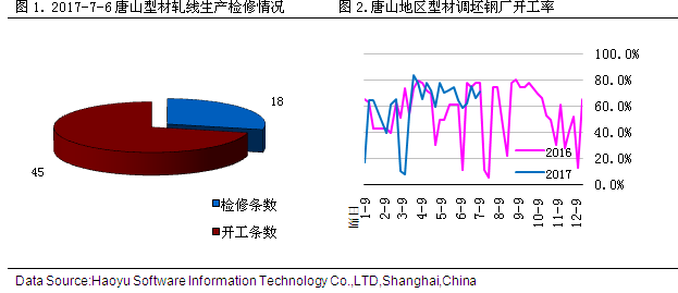 、唐山型材鋼廠開工率小幅上升。據(jù)成都鋼鐵網(wǎng)7月6日統(tǒng)計(jì),44家型廠63條生產(chǎn)線開工45條,較上周增加3條,開工率為71.43%,較上周上升了4.76%。 三、市場庫存概覽
