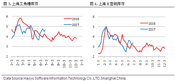 據(jù)2017年7月7日對上海市場型材倉庫進(jìn)行的同口徑調(diào)查統(tǒng)計(jì)顯示,工角槽庫存4.69萬噸,較上周持平,H型鋼庫存3.39萬噸,較上周持平。 四、鋼廠盈利空間分析