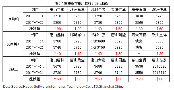 成都鋼鐵網(wǎng)資訊7月21日消息: 本周焦點(diǎn):在型材價(jià)格漲至高位后,高位資源的成交有所放緩,鋼坯目前也暫時(shí)持穩(wěn),當(dāng)下行情缺乏大幅上行的動(dòng)力。不過成本還有支撐,而且環(huán)保因素也在制約產(chǎn)能釋放,行情整體來看還是利多稍占主動(dòng)。考慮到近期行情整個(gè)勢(shì)頭都是向好,預(yù)計(jì)下周型材市場(chǎng)還是延續(xù)小幅偏強(qiáng)的運(yùn)行格局。 【內(nèi)容提要】 ◆本周型鋼市場(chǎng):型市繼續(xù)偏強(qiáng),商戶心態(tài)尚可 ◆唐山型材軋線開工率小幅下降 ◆市場(chǎng)庫存繼續(xù)減少 ◆型廠理論盈利空間小幅增加 ◆預(yù)計(jì)下周型市穩(wěn)中小幅偏強(qiáng) 一、市場(chǎng)行情回顧