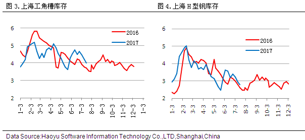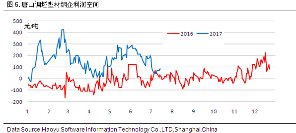 據(jù)2017年7月21日對(duì)上海市場(chǎng)型材倉庫進(jìn)行的同口徑調(diào)查統(tǒng)計(jì)顯示,工角槽庫存4.01萬噸,較上周減少0.21萬噸,H型鋼庫存2.77萬噸,較上周減少0.15萬噸。 四、鋼廠盈利空間分析