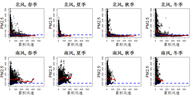 圖3展示了在四個不同季節(jié)下,PM2.5與北風(fēng)和南風(fēng)的累積風(fēng)速的關(guān)系。紅色曲線是擬合二者的回歸函數(shù)。從圖中我們可以明顯看到: