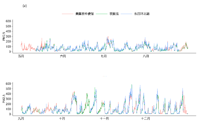 為了相互驗證美國大使館與環(huán)保部數(shù)據(jù)的可靠性,我們比較了從2014年5月1日到2014年12月31日美國駐華大使館與環(huán)保部下屬六個在京站點的逐小時PM2.5觀測值。這些數(shù)據(jù)高度一致,其中農(nóng)展館和東四環(huán)北路是與大使館地理位置最接近的兩個環(huán)保部監(jiān)測站點,它們同使館數(shù)據(jù)的相關(guān)系數(shù)分別為0.96和0.95