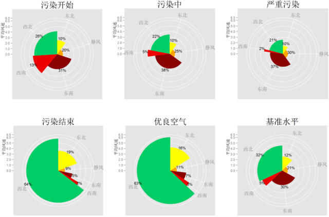 圖2:污染過程從污染開始、污染中、嚴(yán)重污染、污染結(jié)束到優(yōu)良空氣狀態(tài)下的風(fēng)向分布及各風(fēng)向下的平均風(fēng)速。