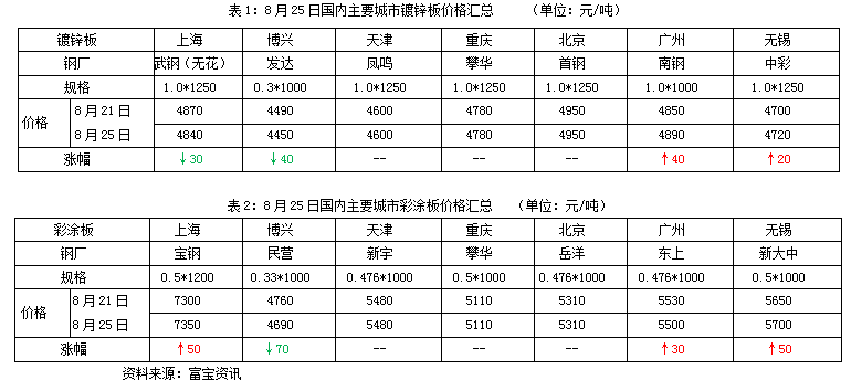 成都鋼鐵網(wǎng)資訊8月25日消息: 本周行情綜述 本周全國涂鍍市場穩(wěn)漲跌均有,幅度在50-100元/噸。截止目前,上海地區(qū)無花鍍鋅卷資源主流價格在4840-4900元/噸,彩涂卷寶鋼資源主流價格7200-7300元/噸;山東博興地區(qū)0.3*1000主流價格4400-4430元/噸;彩涂卷0.17主流價格5330-5350元/噸,天津地區(qū)鍍鋅卷鳳鳴資源主流價格在4550-4570元/噸;廣州地區(qū),鍍鋅卷南鋼資源主流價格在4810-4860元/噸;彩涂卷0.476華美6320元/噸。具體來看,周初,期貨市場強勢上揚,加之周末鋼坯堅挺表現(xiàn),成品材市場主流跟漲。其中鍍鋅卷資源主流漲30-100元/噸,彩涂卷市場多居高觀望出貨。但漲后出貨阻力凸顯,因此價格續(xù)漲乏力,部分市場出現(xiàn)松動走貨現(xiàn)象,另外周中期貨市場大幅下行,市場心態(tài)偏弱,因此市價開始低靠,然降后成交依舊難有放量。周末臨近,期貨市場止跌回漲,市場重拾信心,但在需求有限的情況下,市場跟漲現(xiàn)象不是很多,大多維持平穩(wěn)出貨心態(tài)。在大環(huán)境偏暖的情況下,期貨漲跌頻繁,商家對后市持謹慎觀望情緒居多。 具體價格如下