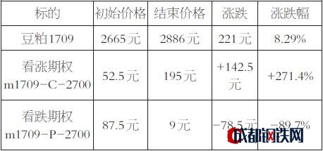 由上表可以看出,同樣是做多,用大漲的方向買(mǎi)入看漲期權(quán)m1709-C-2700盈利142.5元/張,用小漲的方向賣(mài)出看跌期權(quán)m1709-P-2700盈利78.5元/張,差別比較大,但都能盈利。