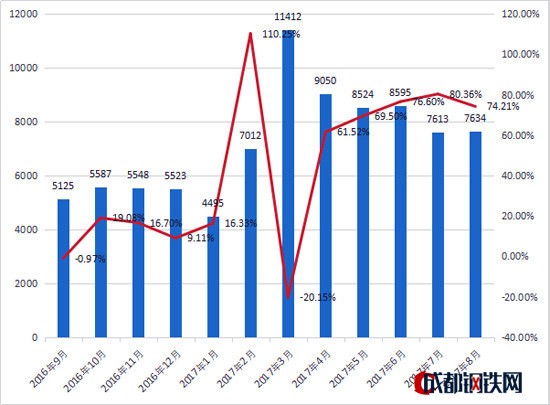 2016年9月-2017年8月裝載機月銷量及同比增長情況