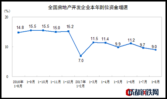 1-8月份,房地產(chǎn)開發(fā)企業(yè)到位資金99804億元,同比增長(zhǎng)9.0%,增速比1-7月份回落0.7個(gè)百分點(diǎn)。其中,國(guó)內(nèi)貸款16904億元,增長(zhǎng)19.0%;利用外資112億元,增長(zhǎng)15.4%;自籌資金31439億元,下降1.7%;其他資金51349億元,增長(zhǎng)13.4%。在其他資金中,定金及預(yù)收款30786億元,增長(zhǎng)20.0%;個(gè)人按揭貸款15764億元,增長(zhǎng)2.4%。