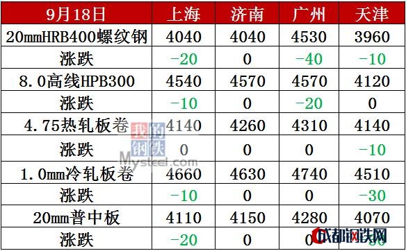 9月18日,國內(nèi)鋼材市場(chǎng)弱勢(shì)下行。其中,上海、廣州、北京、重慶等19個(gè)城市螺紋鋼價(jià)格下跌10-80元/噸;杭州、福州、天津、重慶等14個(gè)城市熱卷價(jià)格下跌10-50元/噸;上海、長(zhǎng)沙、天津、重慶等10個(gè)城市中厚板價(jià)格下跌10-40元/噸。