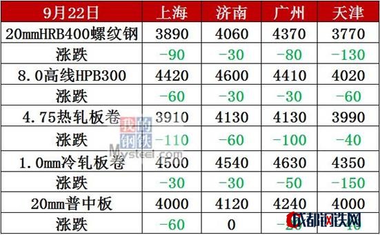 9月22日,國內(nèi)鋼材市場弱勢下行。25個(gè)主要城市中,上海、濟(jì)南、廣州、北京等23個(gè)城市螺紋鋼價(jià)格下跌20-160元/噸;上海、廣州、合肥、天津、沈陽等23個(gè)城市熱卷價(jià)格下跌10-130元/噸;上海、濟(jì)南、重慶、北京等21個(gè)城市中厚板價(jià)格下跌10-80元/噸。