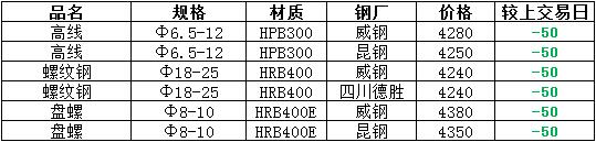 宜賓訊:26日宜賓市場建筑鋼材價格小幅下跌,市場價格較前一日下跌50元/噸,具體如下: