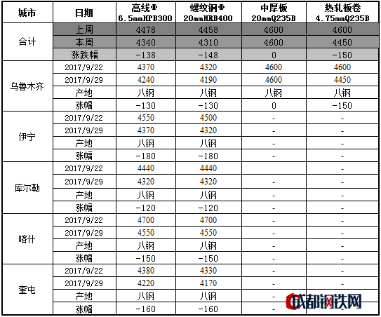 本周新疆鋼材市場各品種資源價格大幅上漲。長材方面:本周受疆內(nèi)市場成交收窄的影響,本地市場建材價格大幅下跌130-140元/噸不等;板材方面:受京津冀等華北板材市場價格弱勢下跌的影響,本地市場板材價格大幅松動150元/噸。型材方面:受八鋼佳域下調(diào)板材價格的影響,本地市場型鋼價格小幅下跌80元/噸。