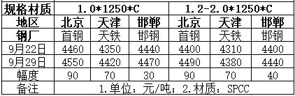 概述:周京津冀冷卷止跌反彈,下游對低價(jià)資源有一定認(rèn)可,觀望情緒有所改善??偠灾?,9月份冷軋市場走出旺季不旺的行情,階段性漲幅過快也隨著價(jià)格回調(diào)得到充分釋放,基于后續(xù)冷軋資源供給縮減的預(yù)期,筆者有理由相信節(jié)后市場或走出先穩(wěn)后揚(yáng)的行情。具體情況如下: