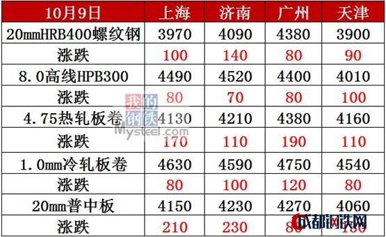 10月9日,國內(nèi)鋼材市場普遍大漲。25個主要城市中,上海、濟南、廣州、北京等23個城市螺紋鋼價格上漲20-180元/噸;上海、武漢、天津、沈陽、重慶等22個城市熱卷價格上漲70-190元/噸;上海、濟南、北京、重慶等21個城市中厚板價格上漲50-230元/噸。