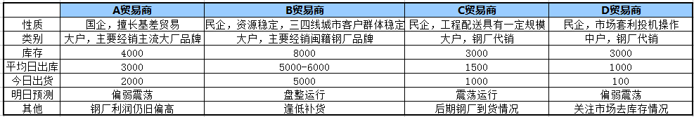 結(jié)論:今日早盤受夜盤期螺下挫、前日成交不暢等影響,商家報(bào)價(jià)多小幅下調(diào),午盤低位成交略有回暖,但市場信心不足,午后低價(jià)資源仍然存在。