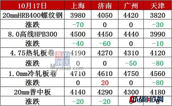 10月17日,國內(nèi)鋼材市場弱勢下行。25個主要城市中,上海、長沙、天津、重慶等14個城市螺紋鋼價格下跌10-150元/噸;杭州、廣州、北京、沈陽等14個城市熱卷價格下跌20-90元/噸;上海、濟南、北京、重慶等14個城市中厚板價格下跌10-50元/噸。