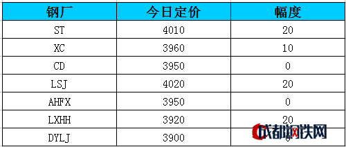 10月23日杭州市場7家廠庫前移鋼廠螺紋鋼銷售指導(dǎo)價:CD 3950元/噸、AHFX 3950元/噸、DYLJ 3900元/噸價格持穩(wěn);XC 3960元/噸較上一交易日上調(diào)10元/噸;ST 4010元/噸、LSJ 4020元/噸、LXHH 3920元/噸較上一交易日上調(diào)20元/噸。