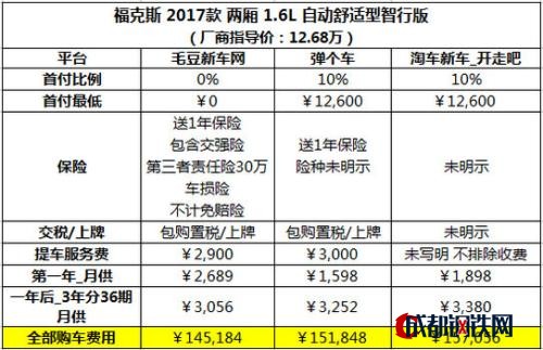 眾所周知,品牌知名度大幅度領(lǐng)先能夠使平臺(tái)擁有更多的潛在消費(fèi)用戶,但最終能否轉(zhuǎn)化為成交則顯得更為重要,而促使消費(fèi)者買單的關(guān)鍵因素則是同類型平臺(tái)之間的性價(jià)比。為比較三家的性價(jià)比,挑選了消費(fèi)者熟悉的??怂?017款1.6L自動(dòng)智行版,且正好這款車三家平臺(tái)都有重點(diǎn)推薦。