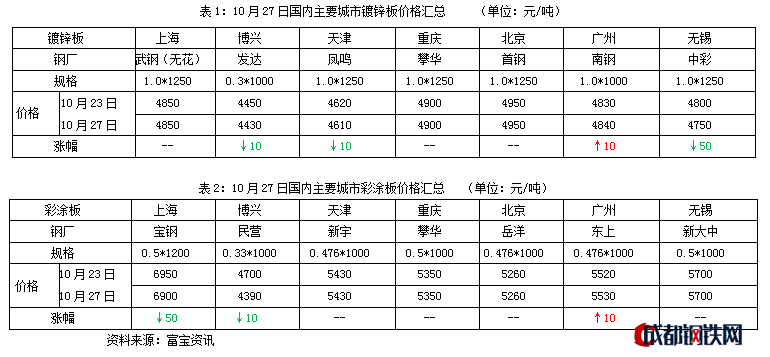 成都鋼鐵網(wǎng)資訊10月27日消息: 本周行情綜述 本周全國(guó)涂鍍市場(chǎng)先揚(yáng)后抑,整體價(jià)格變動(dòng)不是很大,波動(dòng)幅度在20-50元/噸。具體來看,周初受上周末原料鋼坯價(jià)格堅(jiān)挺支撐,加之期貨表現(xiàn)亦搶眼,商家心態(tài)上有明顯好轉(zhuǎn),故開市商家多高抬報(bào)價(jià)。但考慮到月末資金壓力趨緊張,且需求始終難有放量,因此整體漲幅有限,多在20-50元/噸。但商家多反映漲后成交阻力加大,成交難有放量。加之周中以后期貨轉(zhuǎn)而下行,且跌幅擴(kuò)大,受其拖累,商家整體情緒偏弱。市場(chǎng)開始出現(xiàn)回調(diào)現(xiàn)象,截止目前,市場(chǎng)上鍍鋅板卷及彩涂卷價(jià)格較周初多持平。另外還了解到,因當(dāng)前市場(chǎng)上整體庫(kù)存量不是很大,因此市場(chǎng)上也有不少挺價(jià)現(xiàn)象。就山東博興地區(qū)的民營(yíng)鋼廠來看,其中0.3*1000周初價(jià)格在4460元/噸,受期貨及原料鋼坯堅(jiān)挺運(yùn)行影響,窄幅上揚(yáng)20-30至4480元/噸,但漲后成交欠佳,加之期貨弱勢(shì)震蕩,故開市弱勢(shì)回調(diào)至周初價(jià)格4460元/噸。據(jù)當(dāng)?shù)刭Q(mào)易商反饋,當(dāng)前整體需求有限,月底多維持平穩(wěn)出貨即可,無太大調(diào)價(jià)之意。綜合本周來看,在供需兩不旺的情況下,價(jià)格窄幅震蕩,商家操作上多以平穩(wěn)出貨為主。 價(jià)格具體價(jià)格如下